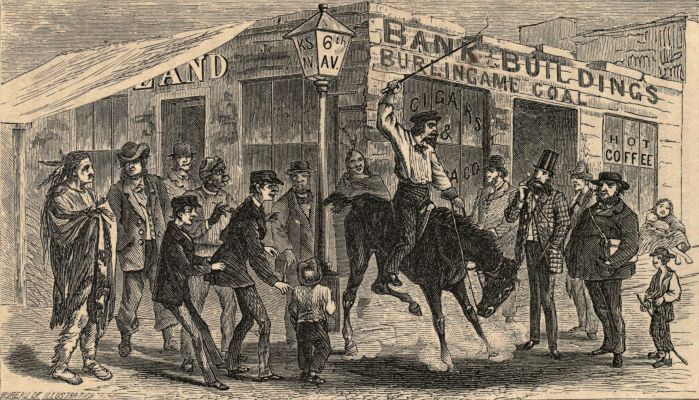 That horse-auction was a sight worth seeing. The crowd collected most thickly on the corner of Kansas Avenue and Sixth Street, and before it the cob came to a stand. And it was a stand--as stiff and painful as that of a retired veteran put on dress parade. The limbs would have had full duty to perform in supporting the carcass alone, which had evidently been in light marching order for years past. The additional weight of the auctioneer must certainly have proved altogether too much, had not the horse heard, for the first time, of the wonderful qualities with which he was still endowed.