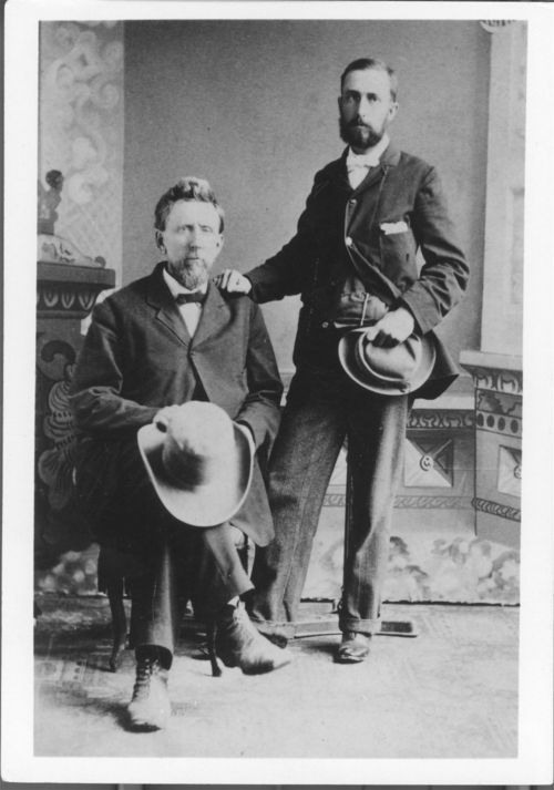 A portrait of Joseph McCoy and his brother James McCoy. Joseph, a young cattle dealer from Illinois, induced Texas herders to drive their cattle to Abilene, Kansas. In 1871, increased settlement and sentiment against rowdy cowboys forced the trail drivers to move from Abilene to other towns, notably Newton and Ellsworth. Joseph McCoy remained involved in the cattle trade after the shipping center moved from Abilene.