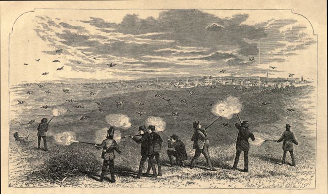 The prairie-chicken is now extinct in many of the Western States where it was once well known. Usually, during the first few years of settlement, it increases rapidly, and is often a nuisance to pioneer farmers. Perhaps, when the latter first settle in a country, a few covies may be seen; under the favorable influences of wheat and corn-fields, the dozens increase to thousands and cover the land. But with denser settlement come more guns, and, what is a far more destructive agent, trained dogs also. Under the first order of things, the farmer, with his musket, might kill enough for the home table. With double-barreled gun and keen-scented pointer, the sportsman and pot-hunter think nothing of fifty or sixty birds for a day's work. It seems almost impossible, under such a combination, for a covey to escape total annihilation.