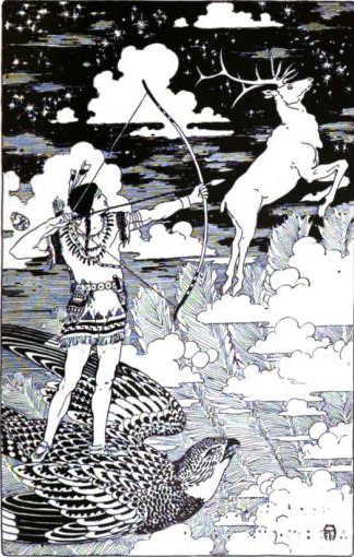The struggle with fire-serpents, in order to reach the wicked Pearl Feather, whom he fought the livelong day, has been recounted again and again. How a woodpecker flew overhead, screaming "Shoot at his scalp-lock!" How, obeying this admonition, Hiawatha saw the enemy fall in the throes of death, and dipping his finger in the blood, touched the bird, and to this day a red mark is found on the head of the woodpecker. He slew the Prince of Serpents, traveled from village to village performing good works, and having wedded a beautiful Dakota woman, presented a perfect example of faithfulness and devotion. A league of thirteen nations was formed through the influence of this remarkable man; and as he stood among the assembled chiefs, addressing them with supernatural eloquence, encouraging them in a voice of sweetness and power to lives of rectitude, the summons came. Promising to return at some future time, Hiawatha stepped into his white stone canoe and was lifted heavenward, the air trembling with soft music as he floated from sight. To this final pledge are attributable many ghost dances and outbreaks against the whites, notably that at Pine Ridge Agency, when the coming of the Messiah was expected with full confidence.