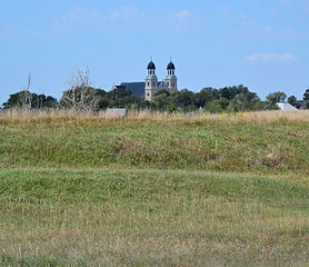 In the early 1870's, approximately 400 families of Mennonites (about 1,900 persons) migrated to Kansas from southern Russia and settled in Reno, Harvey, Marion, and McPherson Counties. With prosperous churches scattered over the region, their sect numbered approximately n,-ooo(unclear) members, according to the latest U. S. Census figures (Religious Bodies: 1926). German-Russians who came to Kansas from the lower Volga region at about the same time, and settled on the rolling plains country of Rush and Ellis Counties, were chiefly Roman Catholics. They established their own villages and, with much labor and sacrifice, erected large stone churches with colored windows and carved interiors, which rise from the prairie, their spires visible for miles (see Tour 3). The settlers gave their best to the church, even depriving their families of necessities to do so.