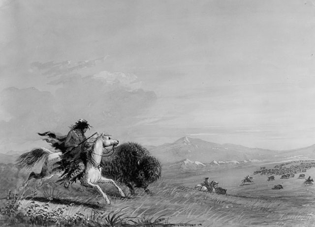 In ancient times the Pawnees had no horses and went hunting on foot. Arrow heads were made of flint or deer horns. Until a recent date, the old stone arrow heads were believed to have supernatural power. White traders introduced those made of iron. The warriors were skillful marksmen and the bow and arrow remained the favorite weapon as long as there were buffaloes to kill. The endurance of the Pawnees, when hunting, was remarkable. In the first place, scouts were sent out to look up a herd. Having discovered one, they returned with information regarding its location. The hunters, disguised as wolves, advanced in a body until within sight, then scattered, forming a large circle, which gradually became less, as they closed in upon the animals. When near enough to begin the attack, a man shouted to attract attention, and the startled buffaloes ran, some one way and some another. Wherever they turned, an Indian, casting off his wolf skin, sprang up and drove them back. At length, the Pawnees, yelling and waving blankets and shooting in the midst of the herd, wore them out. The great beasts, when too tired to run, were easily despatched.