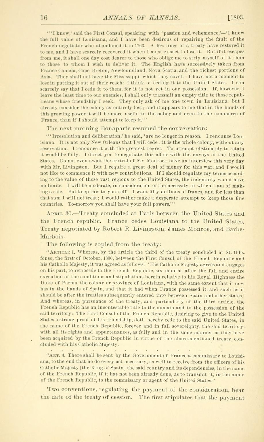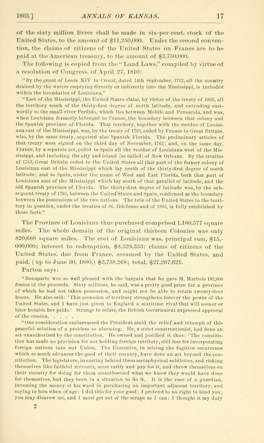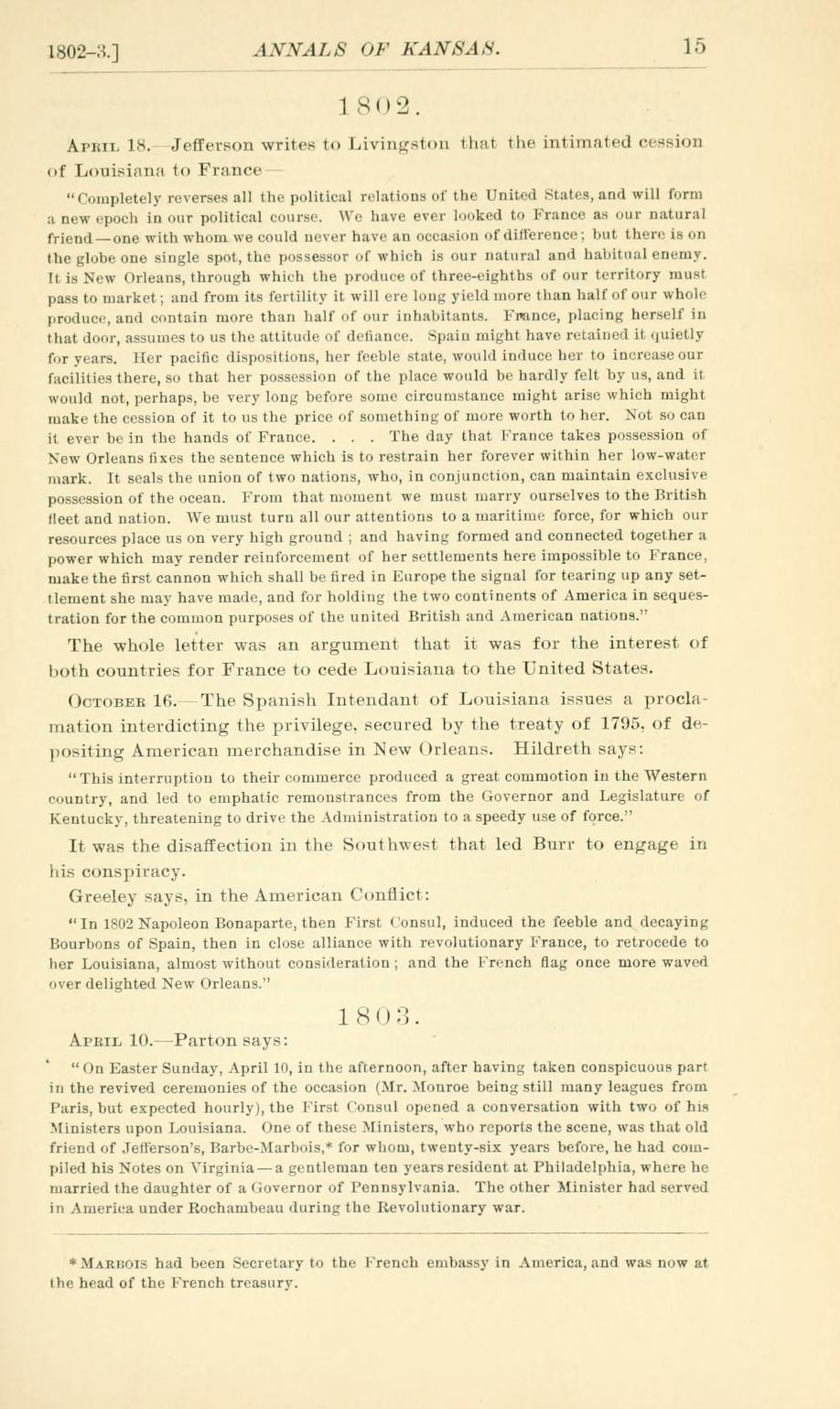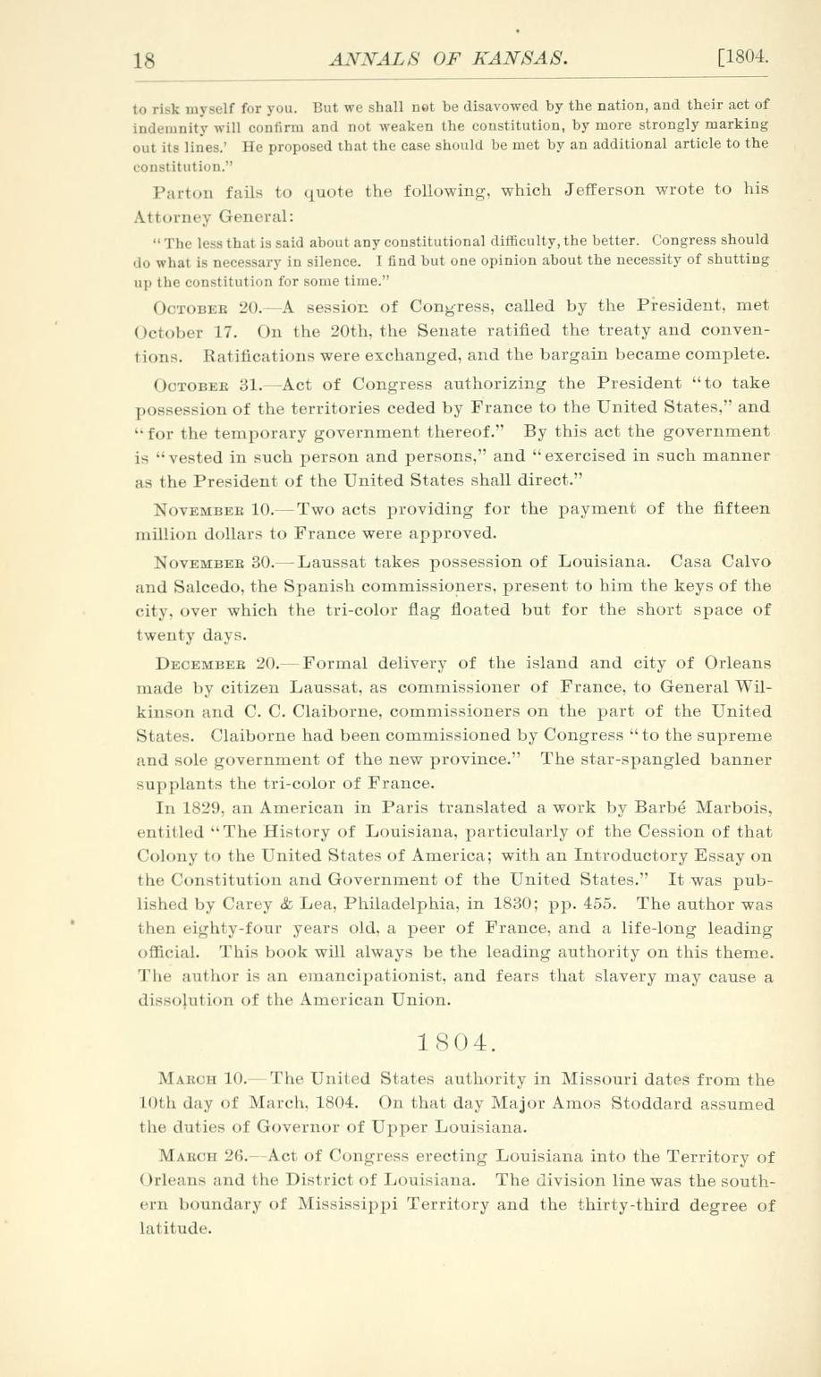 The following page images from the Annals of Kansas by D.W. Wilder, shows us a timeline of how early America and Kansas are linked. These particular pages gives us a timeline about the Louisiana Purchase. These will be of assistance to student and historian alike in researching the state's history. You can download this book by clicking on the link below this article.