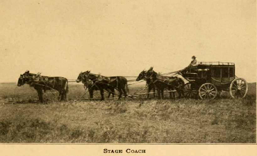 While the West was waiting for its railroads a number of stage routes for carrying mail and passengers were established. The first one was over the Santa Fe Trail. Stages made the trip from Kansas City to Santa Fe in about fifteen days. For many years stage lines were operated between the different towns of the Territory. Later, lines were established to Denver, to Salt Lake, and even to San Francisco.