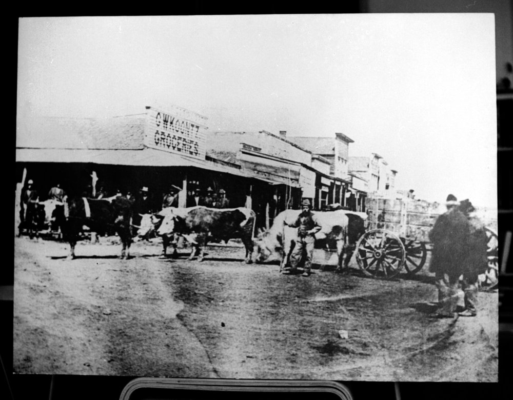 A street scene in Baxter Springs, Kansas, showing the G.W. Koontz grocery store and an oxen-drawn wagon.