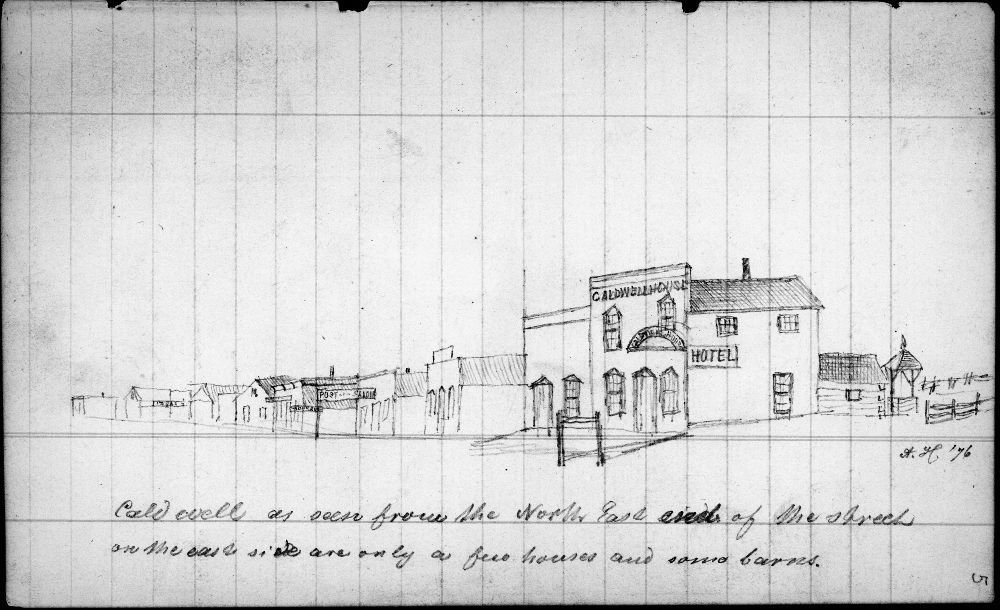 This pencil sketch of Caldwell, Kansas is taken from the Ado Hunnius diary and depicts the Caldwell House Hotel from the northeast end of the street.