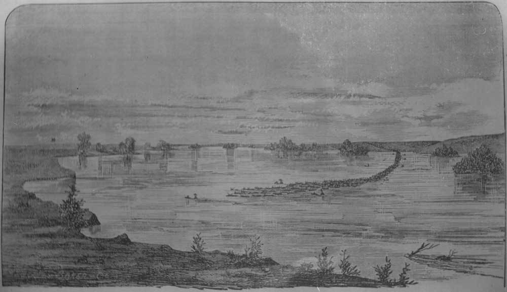 This black and white photograph shows an illustration of cattle swimming the Arkansas River at Wichita, Kansas.