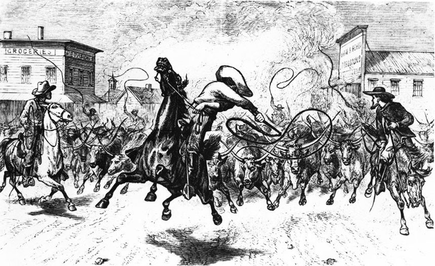 The final destination of the Longhorn cattle of the Texas Cattle trade era was Kansas. Here are several images of the Kansas cowtowns, the final destination of the Longhorns. You will also see some other images about the cattle trade. All images courtesy of the Kansas State Historical Society.