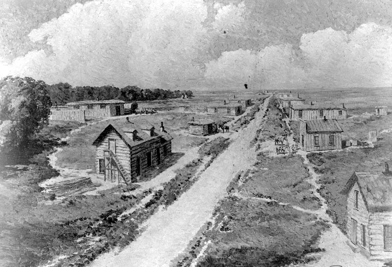 A black and white photograph of "Wichita in 1869" painted by Wichita artist Coy Avon (C. A.) Seward in 1920. On September 28, 1920, The Wichita Beacon noted that the painting was "presented to the [Sedgwick County] Pioneer Society by businessmen in the city" and "shows Wichita as a trading post along a trail (Waco avenue) extending north from the Munger house." On May 1, 1921, The Wichita Eagle reported that the painting was painted "from description and data furnished by William Finn, the city's first surveyor. Mr. Finn declares this picture to be a very true likeness of the city as it appeared to him when he arrived in the late summer of '69." The Pioneer Society later donated the painting to the Wichita-Sedgwick County Historical Museum.