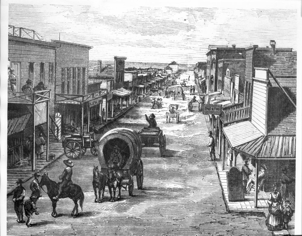 This engraving copied from Harper's Weekly magazine is looking north on main street where it crosses Douglas Avenue in Wichita, Kansas. The illustration is credited to both Paul Frenzeny and Jules Tavernier.