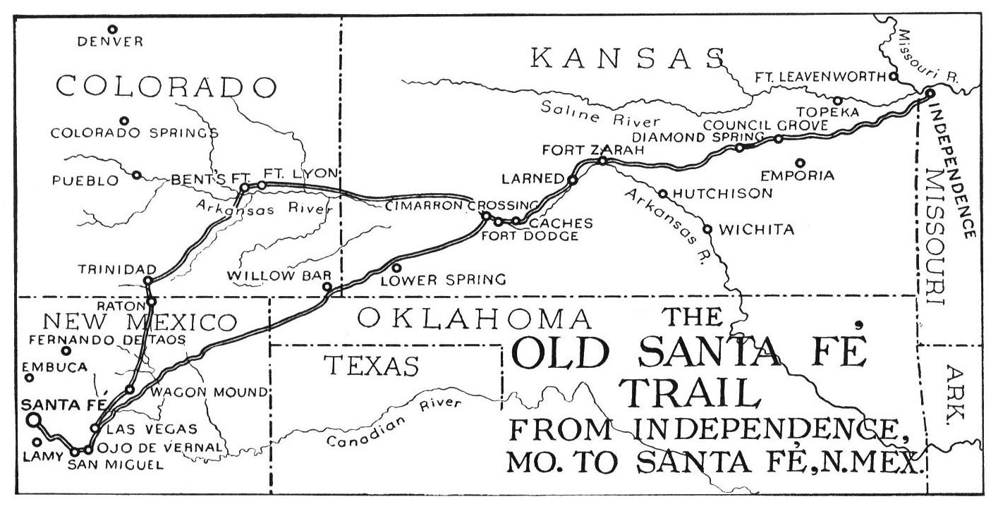 The old Santa Fe Trail led from Franklin, Missouri, through Kansas, Colorado, Oklahoma and New Mexico. It followed the Arkansas River to Cimarron Crossing (Fort Dodge) to La Junta, Colorado; then south, crossing the Raton Pass, joining the main trail at Santa Clara Spring.