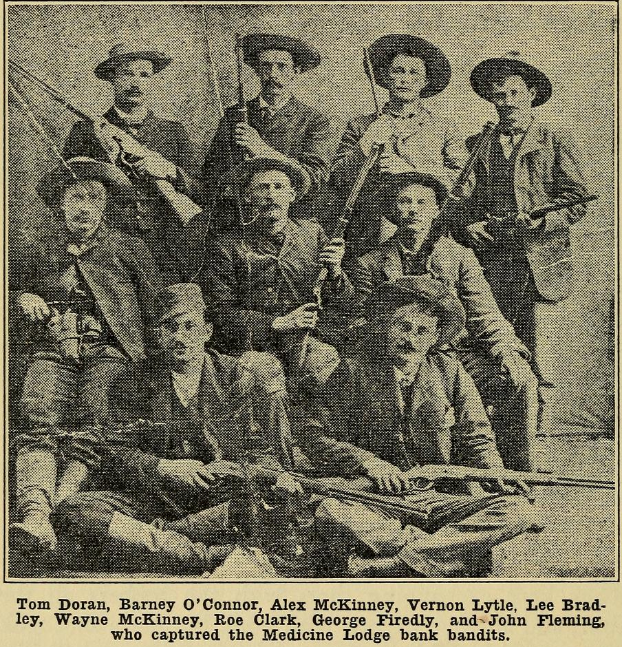 About this time Tom Doran, Lee Bradley, Roe Clark, Wayne McKinney, George Friedly and John Fleming came up. The bandits objected to being taken back to Medicine Lodge, for fear of being hung. Their captors assured them they would be protected and turned over to the sheriff, regardless of the demands of any mob.