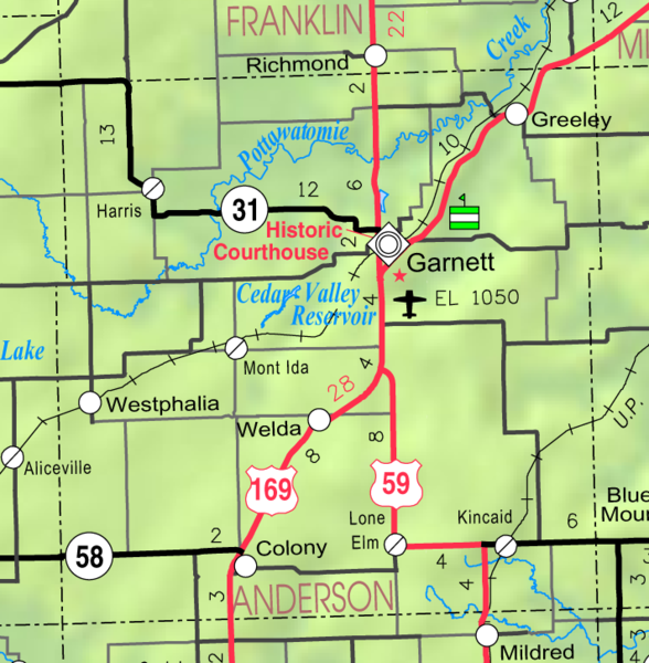 Cutler's History states that, "Anderson County is situated in the second tier of counties west from Missouri, fifty miles south from the Kansas River, and seventy miles north from the Indian Territory. It is in extent twenty-four miles square, and is bounded on the north by Franklin County, on the east by Linn, on the south by Allen, and on the west by Coffey."