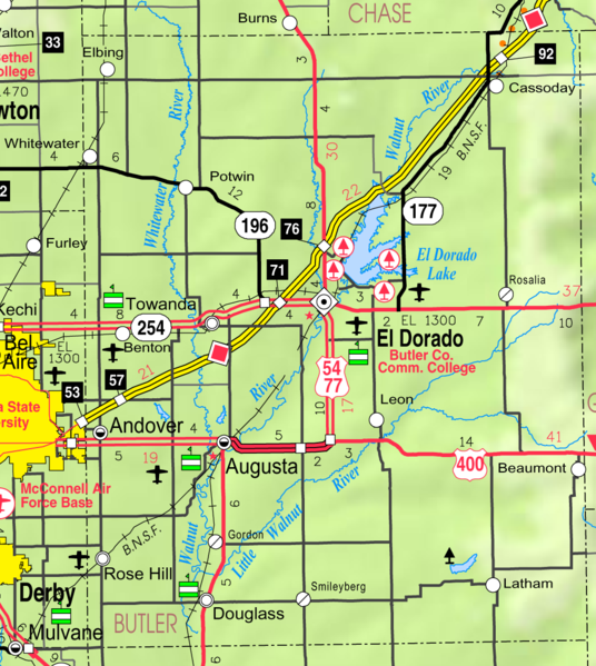 Butler the largest organized county in the State, may well be called 'the State of Butler.' Within it lines lies more territory than that of some of the Eastern States, while its arable land amounts to nearly as much as that of two of the smaller ones. From north to south it stretches forty-two miles, and from east to west thirty-four and a half; making a total area of about one million acres. It is named in honor of Andrew P. Butler, for twelve years United States Senator from South Carolina. Source: Cutler's History of the state of Kansas