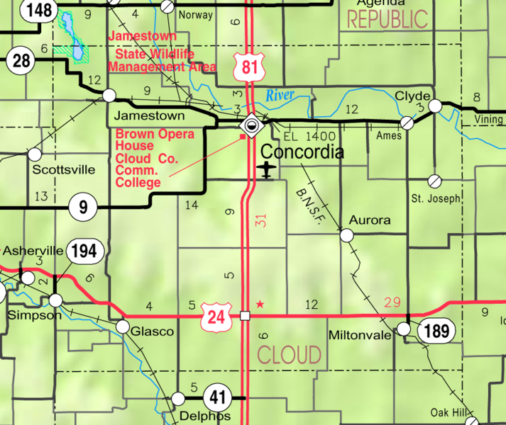 Cloud County, formerly Shirley County, is on the west side of the sixth Principal Meridian in the second tier of counties from the north. It is bounded on the north by Republic, on the east by Washington and Clay, on the south by Ottawa, and on the west by Mitchell and Jewell counties. The northern third of the county lies in the Republican Valley, and its southwest townships are in the valley of the Solomon, making it agriculturally, one of the finest in the State. The elevated, rolling, and quite broken country between the Republican and Solomon rivers at first was considered useless, but a large portion of it is now under cultivation, yet it is better suited for grazing purposes. Source: Cutler's History of the State of Kansas