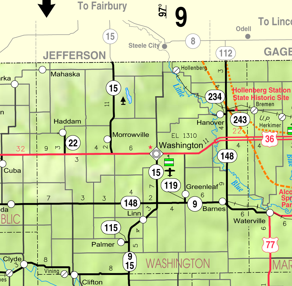 Washington County is fifth in the first tier of counties stretching west from the Missouri River. To the north lay Jefferson and Gage counties, Nebraska; east, Marshall County; south, Riley and Clay counties; west, Republic and Cloud. Washington County is embraced within that fertile territory which lies between the Blue and Republican rivers as they flow southeast into the Kansas River. The Little Blue River pays most particular attention to Washington County, draining, with its branches, all except its southwestern portions.